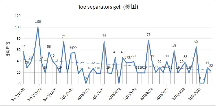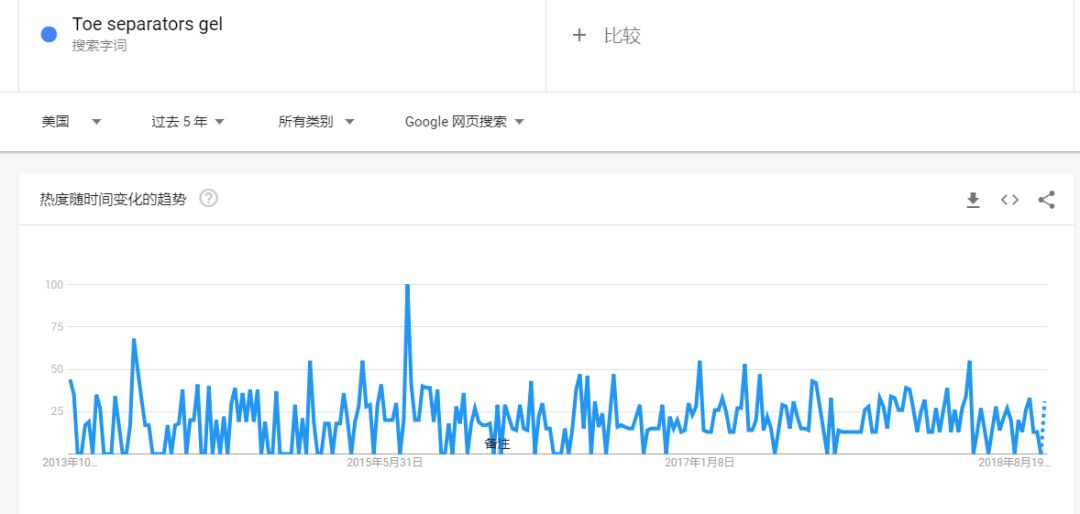 因为脚趾分离凝胶的美国市场需求量小,从近12个月谷歌趋势搜索热度可以看出,它的搜索热度波动明显,季节性不明显。搜索热度高小高峰在11月、3月、6月;在最近五年内的全年需求变化不是很大。
