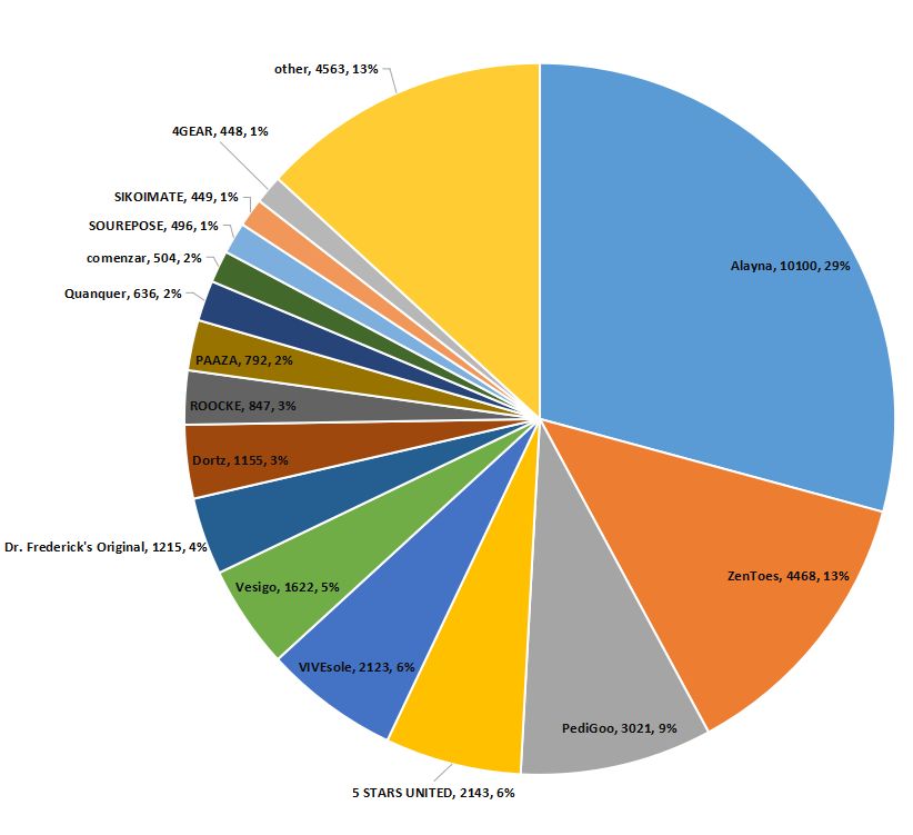 针对拇囊炎矫正器的品牌月预估月销量的调查,我们共抓取了102个产品。其中有15个品牌的市场销量占比在1-29%之间。其中月销量占最大的品牌是Alayna(品牌已是R标,注册人地址位于美国),月销量10100,销量占比29%;品牌ZenToes(品牌已是R标,注册人地址位于美国)月销量4468件,占比13%;品牌PediGoo月销量3021件,销量占比9%。这三个品牌的总月销量为17589件,总销量占比加起来是51%,占了近一半的市场。而市场占比在1%的品牌的月销量在400-500件左右,由此可以看出,仍旧有50%的市场分额可以给到新卖家去竞争,在做好自身listing优化的基础上,如果产品有一定的差异化,仍旧有很大的市场空间。