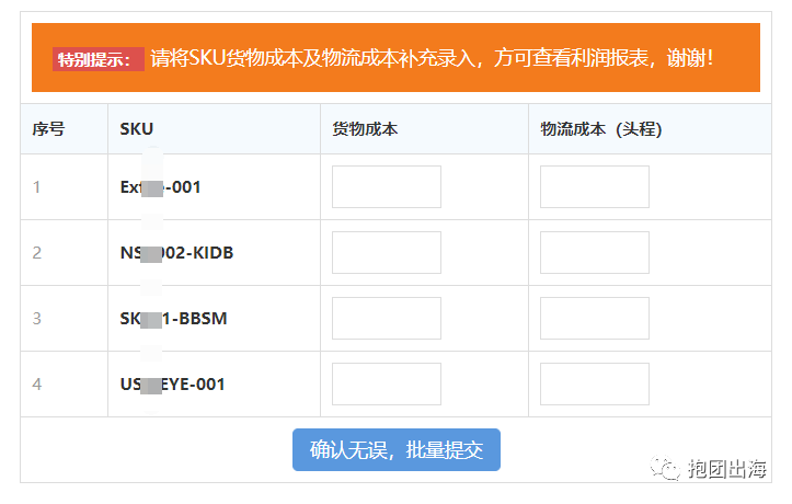 系统会自动提取报表中包含的所能SKU信息,需要录入你的SKU成本,主要是“货物成本”和“物流成本”