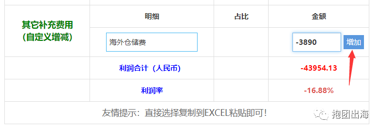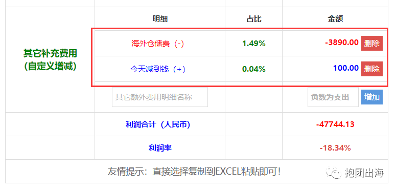 那么,对于有海外仓的商家就可以自己增加费用,注意:支出是负数,
