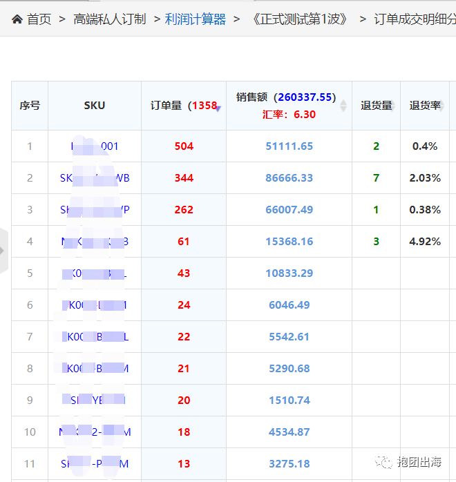点击订单数,还可以展示每个SKU的销量及退货率。