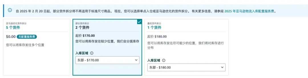 最后,值得注意的是,从2025年2月20日起,部分货件拆分选项将不再适用于标准尺寸商品。这意味着,在该日期当天或之后创建的标准尺寸商品的入库计划将不再显示部分货件拆分选项。不过,对于在2025年2月20日之前创建的货件计划,这一变更将不会产生影响。