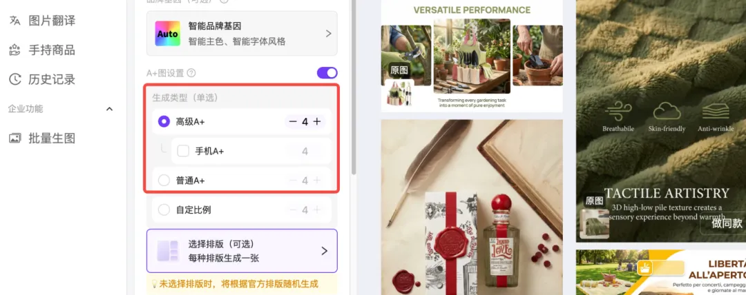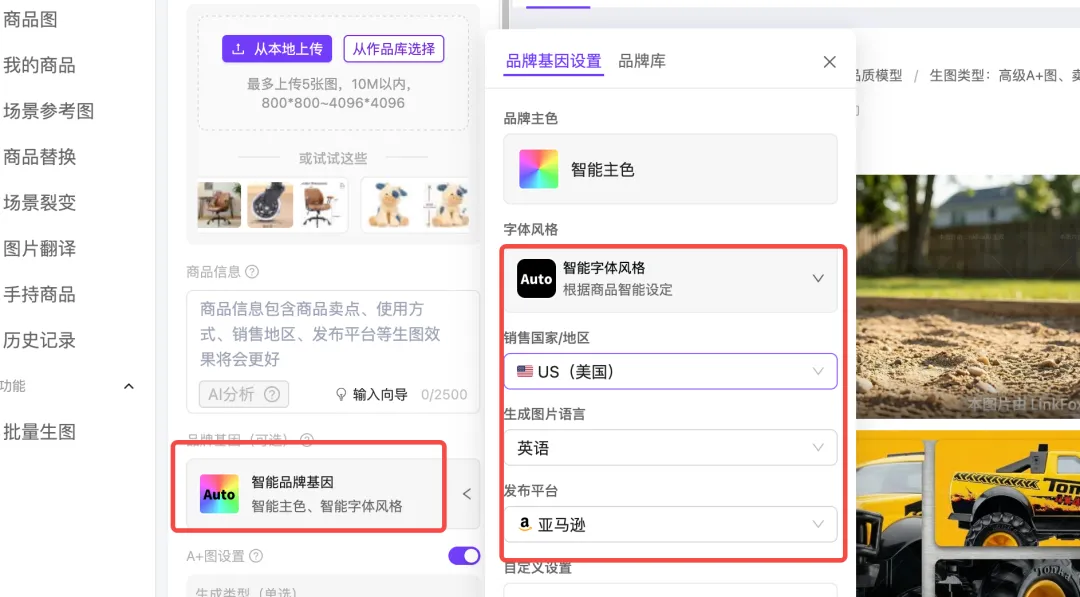 先点击品牌基因,可以选择字体风格对应的销售国家,平台,语种,让出图一步到位,出图就可以用。