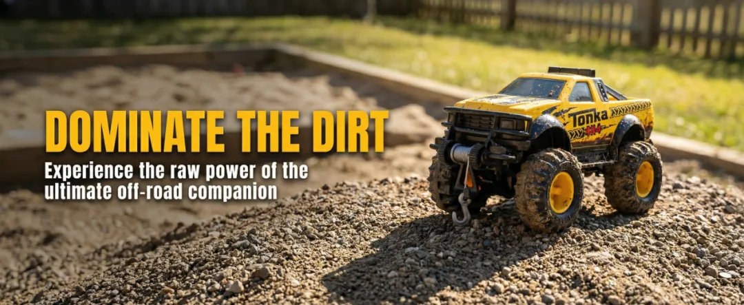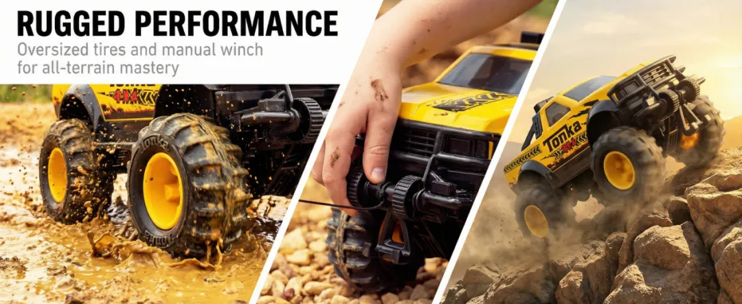 关于全地形轮胎抓地/减震/通过性的卖点。轮胎不是写一句anti-slip就完了,而是用近景把纹理、尺寸、泥地效果展示出来。用户会自动脑补:草地、沙地、碎石都能玩。