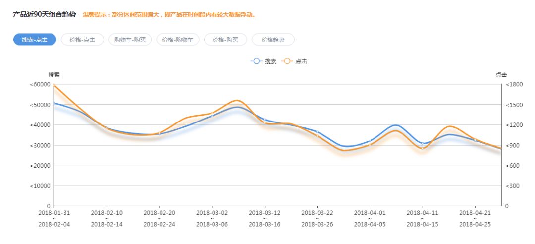 (搜索量看左侧坐标、蓝色曲线;点击量看右侧坐标、红色曲线)