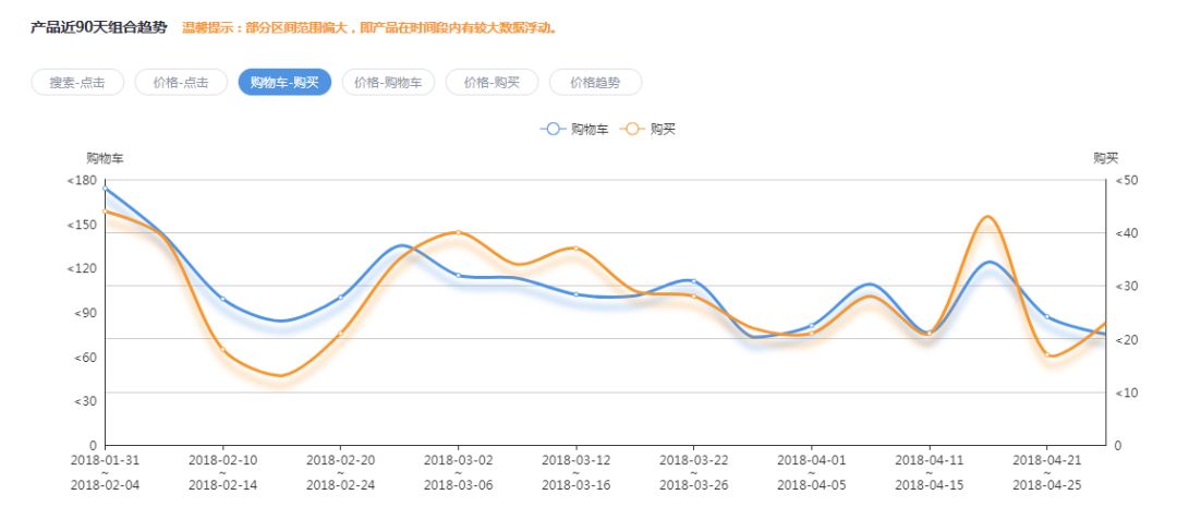 最后,报告中也展示了商品的各趋势图:搜索-点击、价格-点击、购物车-购买、价格-购物车、价格-购买、价格趋势。
