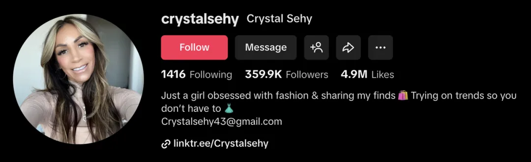 crystalsehy是一位典型的时尚与穿搭类内容创作者,拥有35万粉丝。她的账号整体风格亲切自然,强调“帮你试穿趋势单品”的定位,让观众无需亲自踩雷就能完成选择。