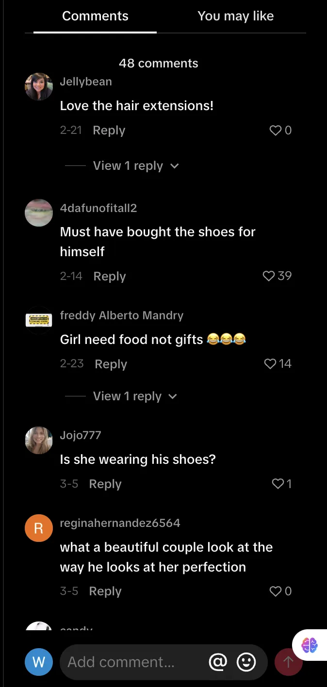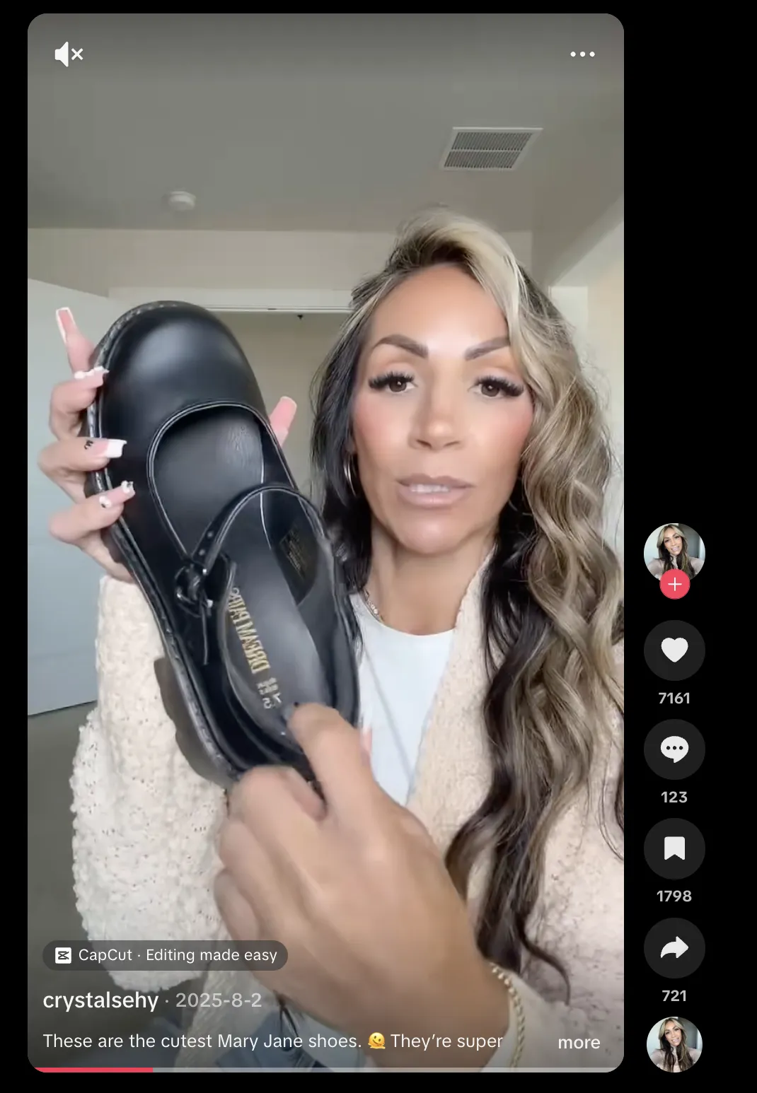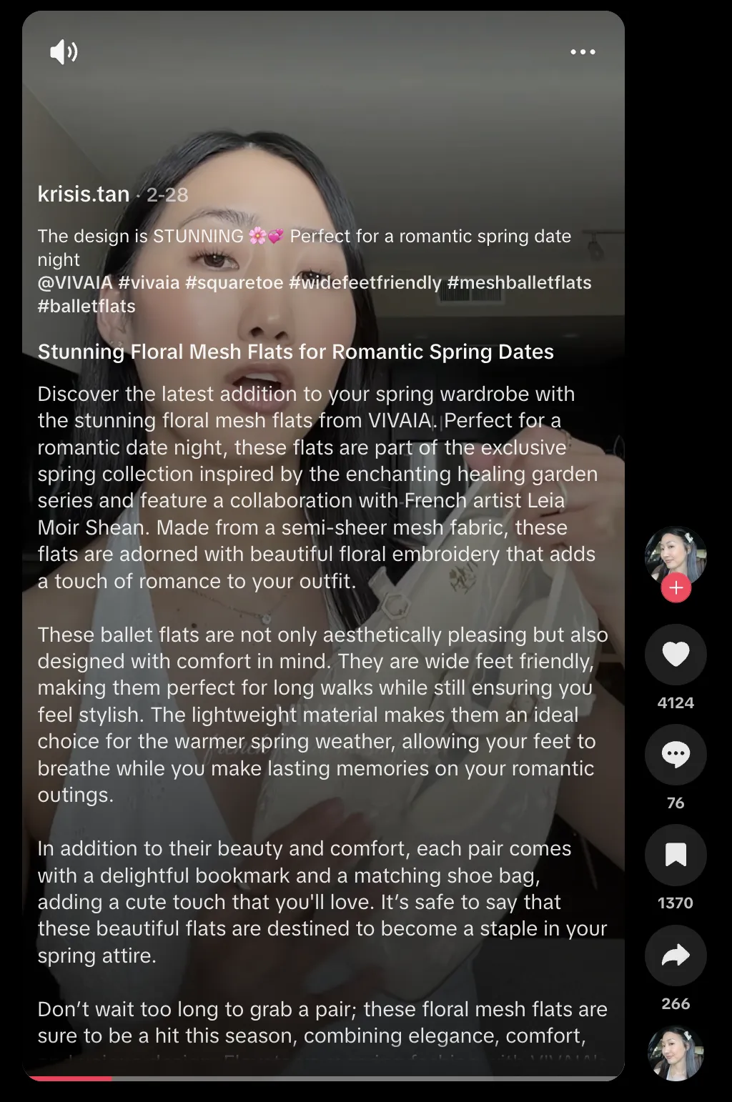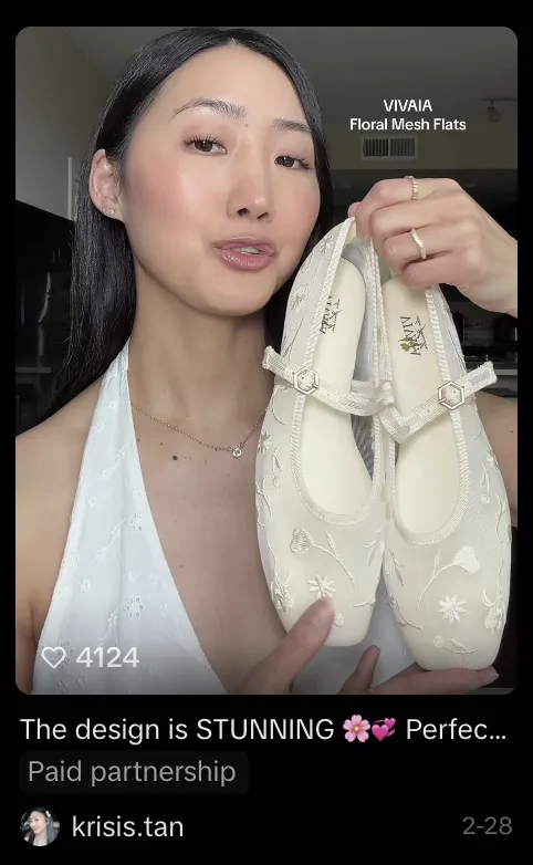 视频中还明确标注了“Paid partnership”,并通过@品牌与标签强化曝光,同时强调“spring date”“wide feet friendly”等关键词,将产品与具体使用场景绑定。这种“场景化卖点”比单纯功能描述更容易打动用户。
