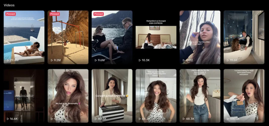 从内容结构来看,她的视频以穿搭展示为主,同时融合美妆、发型与生活方式内容,形成完整的“理想生活叙事”。