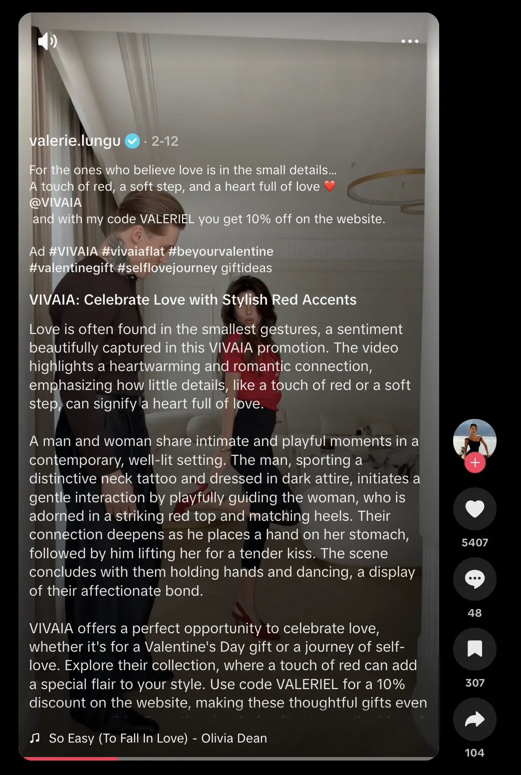在与 VIVAIA 的合作中,valerie.lungu 采用的是典型的“情绪化种草”路径。
