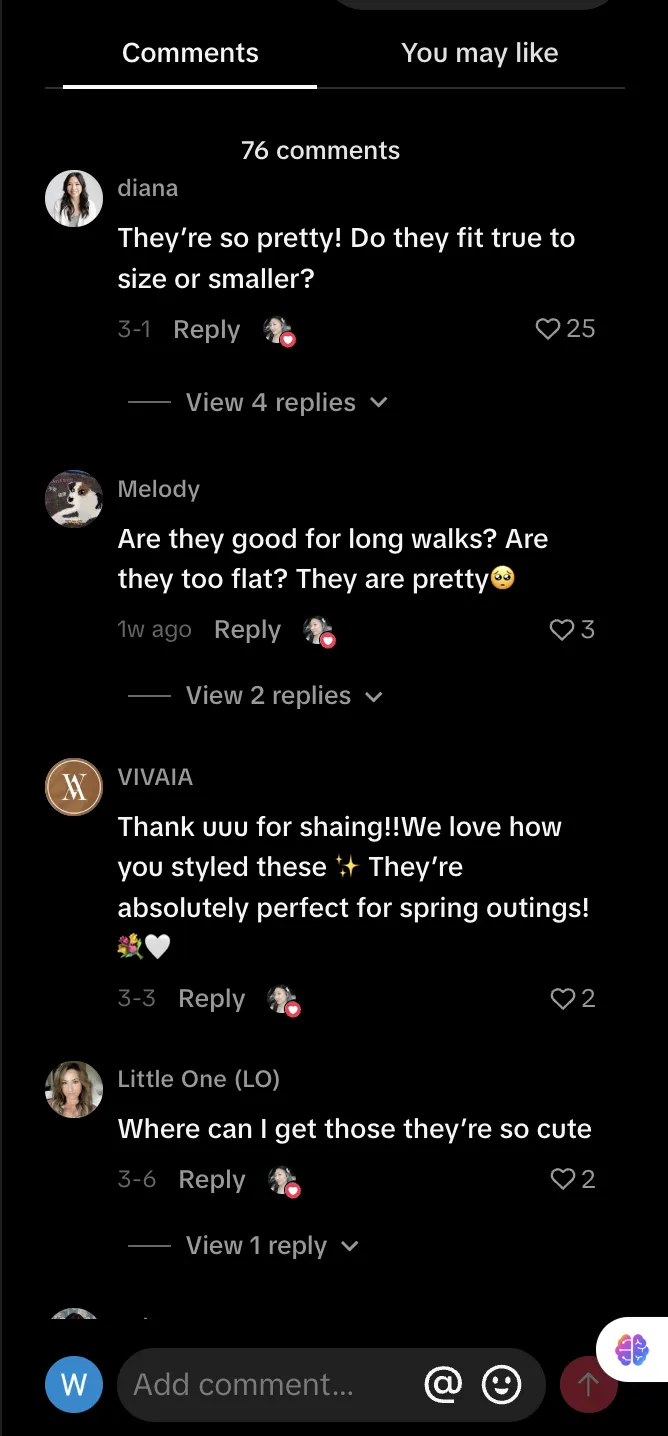 更值得注意的是,VIVAIA 在评论区积极回复用户问题,这种“达人+品牌双向互动”的模式,不仅增强了信任感,也进一步推动了转化。