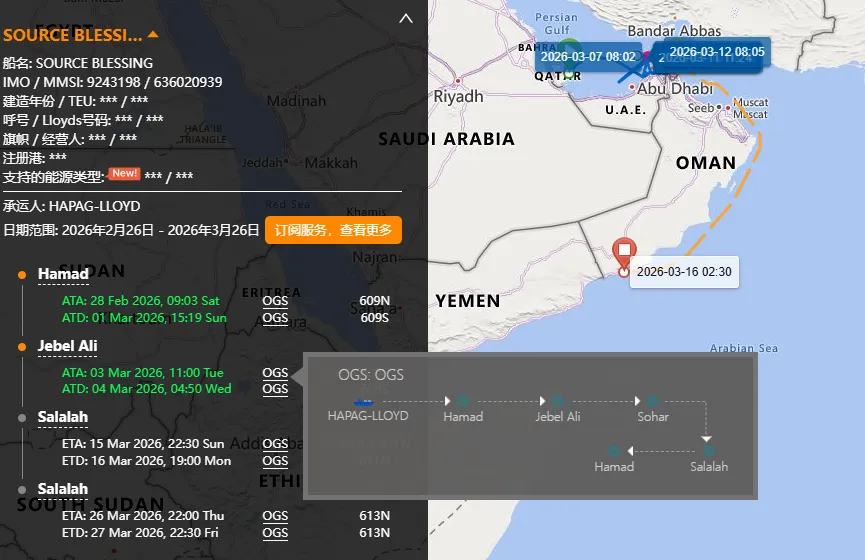 据悉,“Source Blessing”号为中东区域支线船舶,服务于马士基与赫伯罗特共同运营的 Gemini双子星联盟,即赫伯罗特的OGS航线,马士基的M04航线;往返多哈(Doha)、杰贝阿里(Jebel Ali)、索哈尔(Sohar)、塞拉莱(Salalah)等中东主要港口。