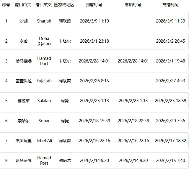 航行记录显示,该船在冲突爆发前一天刚通过霍尔木兹海峡,并在卡塔尔Hamad Port装载货物。此后,该轮一直在卡塔尔和阿联酋附近锚地之间活动,业内推测其可能在等待安全时机通过霍尔木兹海峡返回阿曼湾。