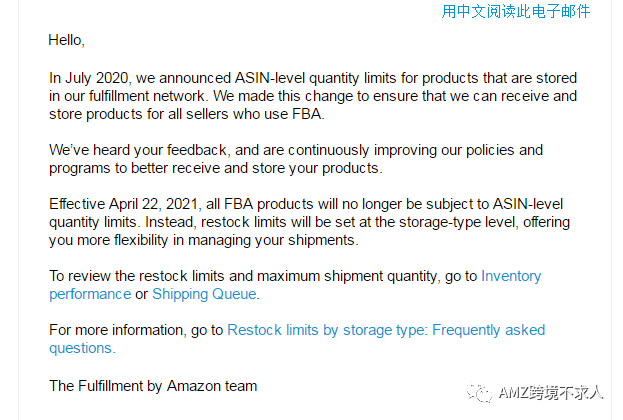 2020年7月,亚马逊宣布了对储存在亚马逊运营中心的商品,实施ASIN级别的入仓数量限制,即每个ASIN有一定的入仓数量上限。做这项变更是为了确保亚马逊运营中心可以接收和储存所有使用亚马逊物流进行销售的卖家的商品。最近,这项政策又发生了变化,相信很多卖家都收到了这封邮件通知:
