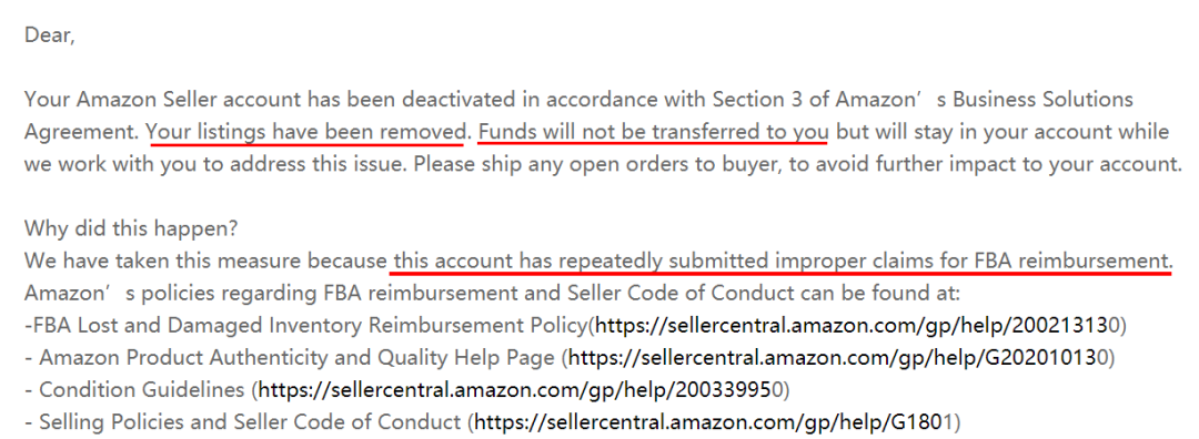 据调查,早在去年年底,就有一位卖家因多次向亚马逊FBA索赔,导致主力店铺被封,损失惨重。亚马逊给出的判定依据和上面的案例一样:违反Amazon商业解决方案协议第3节的规定,即涉嫌商业欺诈。