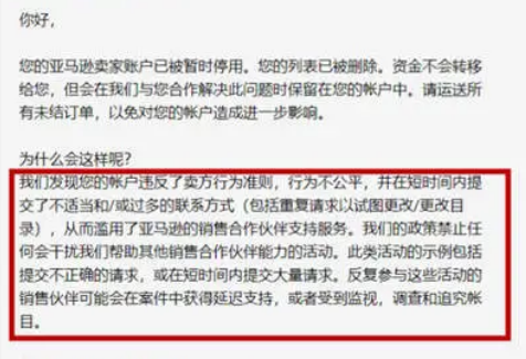 亚马逊封号的理由是:该卖家在短时间内提交了不适当或者大量的重复请求,滥用了亚马逊的销售合作伙伴支持服务。