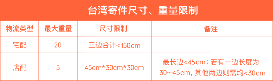 台湾省物流精细化操作程度深,为满足不同客户的配送需求,Shopee在台湾提供宅配与店配服务,宅配在台湾的最终派送由台湾黑猫宅急便完成,店配则由数网派送至指定的7-11便利店等待买家提货。不同物流配送渠道对包裹尺寸有不同的要求: