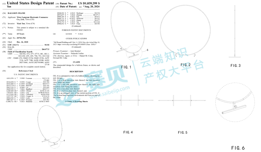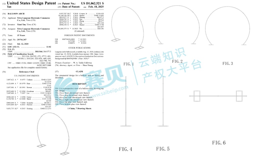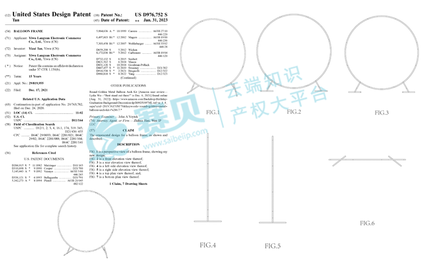 本次案件涉及专利未公布,但赛贝通过检索发现,原告就气球拱门装饰架申请了三个美国外观专利,分别是USD976752S1、USD1062521S1、USD1039299S1,赛贝提醒跨境卖家,如果在设计风格或结构存在相似性,需警惕专利侵权风险。
