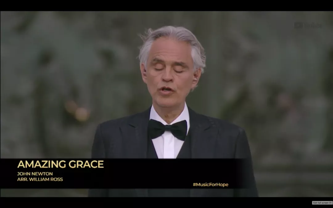 就在复活节的早上,著名的歌剧艺术家,一个看不见世界的盲人歌唱家安德烈·波切利在意大利的米兰大教堂面对全球,做了一场直播音乐会《希望音乐 Music For Hope》。在这20多分钟的视频,在一个西方人特殊的节日里,当安德烈·波切利一个人站在空旷的米兰大教堂门口唱起Amazing Grace《奇异恩典》的时候,镜头掠过全球各地,空旷的街头,无人的城市,顿感人类有多么的渺小。