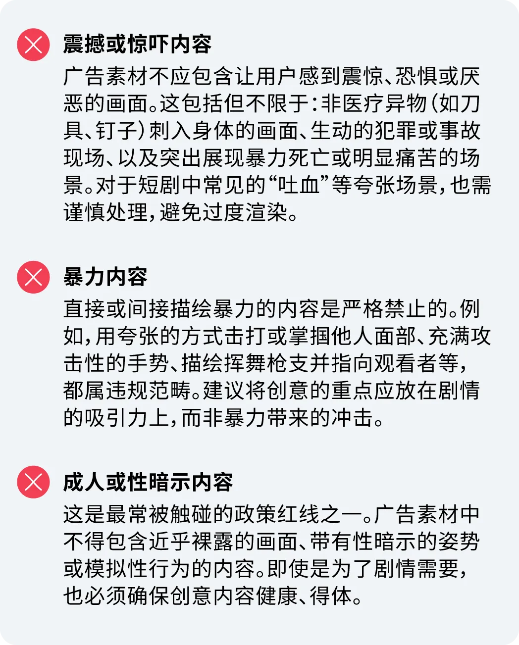了解规则是规避风险的第一步。Meta总结了短剧素材中最常遇到的几类违规内容,广告主需提高警觉,避免踩到“红线”。