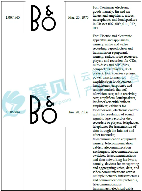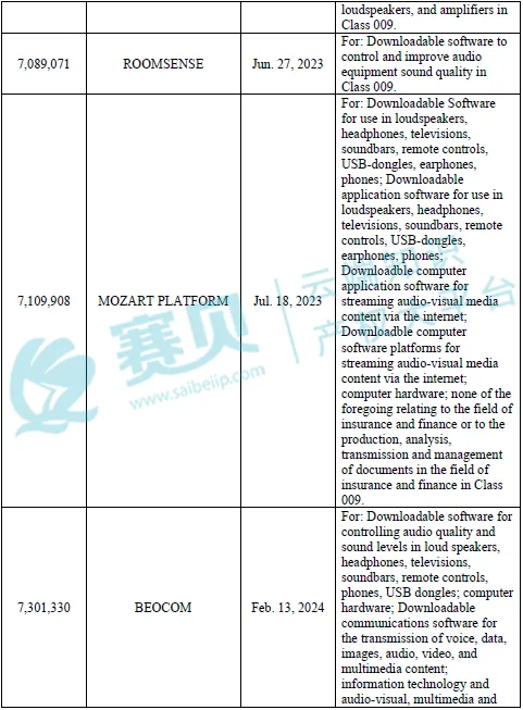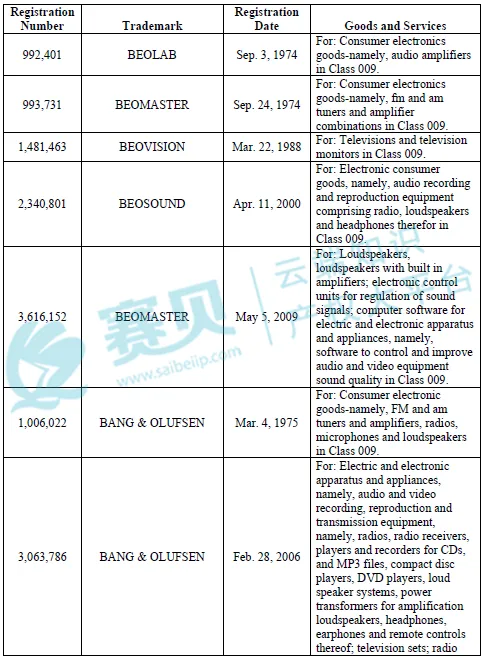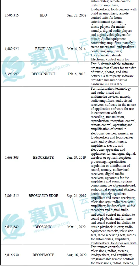 这次B&O维权的是 16 项联邦注册商标,包括 “BANG & OLUFSEN”“B&O” 基础标识,及“BEOLAB”“BEOMASTER”“BEOSOUND”“BEOPLAY” 等 “BEO” 前缀系列,还有 ROOMSENSE、MOZART PLATFORM 等特色商标。主要集中在第 9 类核心电子类,涵盖音响、电视、耳机、遥控器、下载软件等,部分延伸至医疗设备、乐器、家具及零售、维修服务等多个类别。赛贝提醒,未经授权,请勿使用了与原告商标相同或近似的标识,避免侵权。