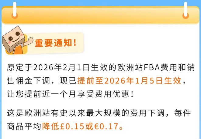 根据亚马逊平台的最新通知,原定于2026年2月1日启动的欧洲站FBA费用及销售佣金下调,将提前至 2026 年1月5日生效,涵盖英国、德国、法国、西班牙、意大利等主流站点。