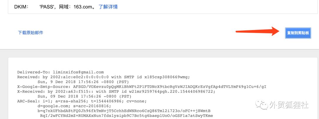 Step1:复制邮件原始文件,以Gmail为例,点击邮件右上角的“更多操作”,点击“显示原始邮件”