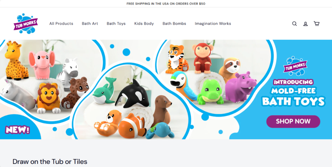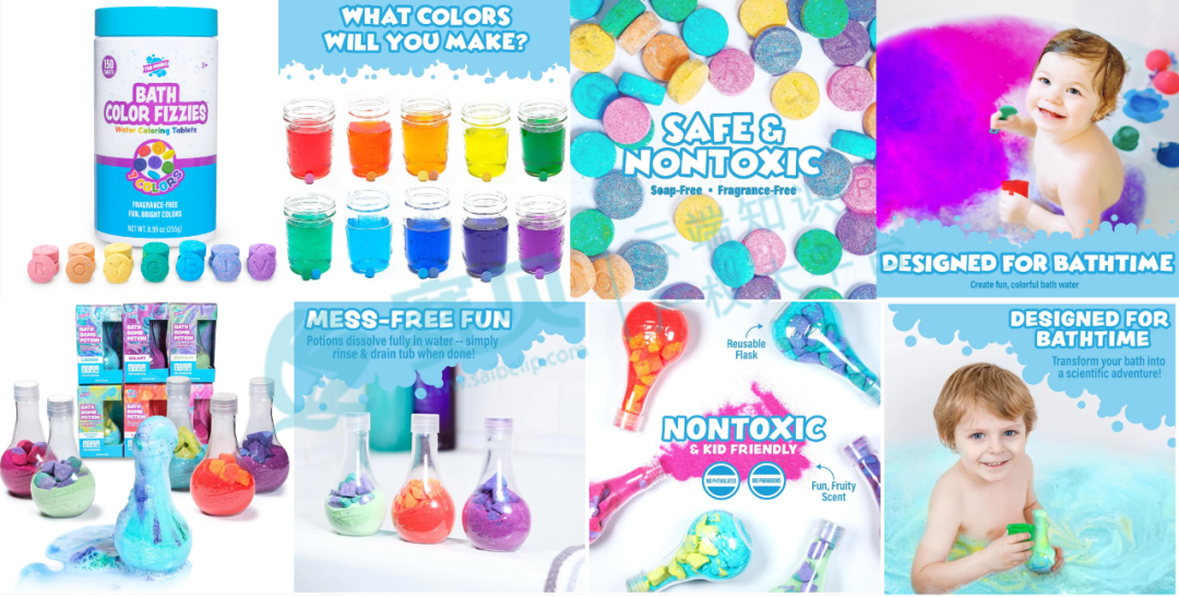 从业务范围来看,Tub Works LLC的核心产品覆盖三大场景:浴室洗护:浴球、沐浴皂(泡沫型、泡泡型、儿童可塑形款)、浴晶、身体乳、个人用精油等;浴室功能产品:用于给bath water染色的片剂、释放舒缓蒸汽的浴泡等;儿童浴室用品:儿童安全浴室涂料、浴缸用蜡笔/着色棒、浴室玩具(带磁铁款、上弦游泳款、动物造型漂浮款)、防水儿童益智游戏等。