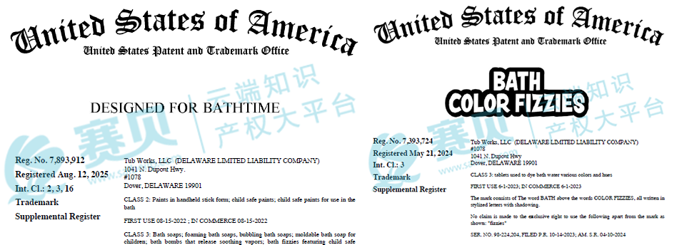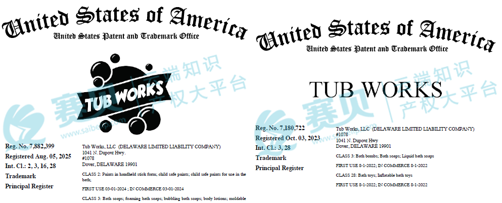 案件涉及4项美国注册商标,涵盖第2、3、16、28类商品,其中“BATH COLOR FIZZES”聚焦浴水染色片剂,“DESIGNED FOR BATHTIME”覆盖儿童安全涂料及多类型沐浴皂等浴室用品,“TUB WORKS”图形+文字版扩展至身体乳、精油及浴室玩具等全品类,纯文字版则侧重浴球、沐浴皂等基础护理产品,所有商标未经授权使用或近似使用均可能构成商标侵权。