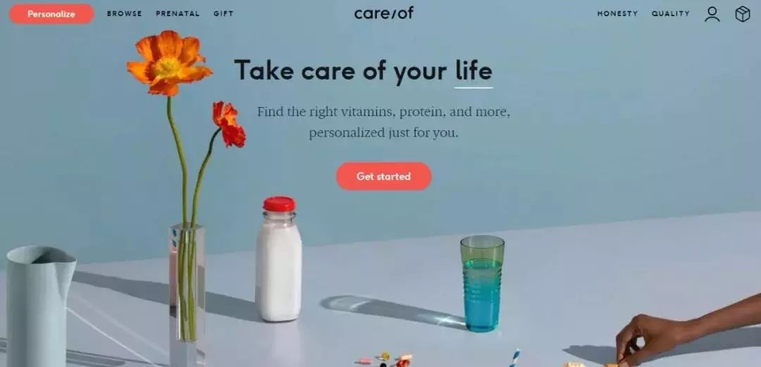 Care/of只通过他们自己的网站销售,要求客户完成一个测试,询问他们的目标、生活方式和信仰体系。在这个网站上,公司根据用户的回答提供定制产品。该公司更加强调透明度、共享研究、成分,并确保客户知道其个性化引擎使用真实的医生和同行评审的研究来提供建议。