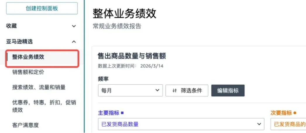 Step2. 在Custom Analytics 页面中,找到「亚马逊精选」板块,进入「整体业务绩效」面板。