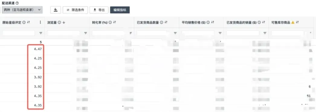 若表格中未显示「原始星级评定」列,点击页面右上角「编辑指标」,在添加指标页面勾选该选项并保存,就能看到商品完整小数位的原始评分。