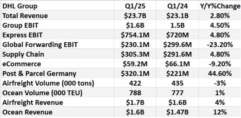 DHL还终止了与SmartLynx Airlines在欧洲的合作关系。此前,DHL曾向SmartLynx租赁4架改装后的A321窄体货机,而SmartLynx目前已决定将业务重心转向为客运航空公司提供运力支持。不久后,FreightWaves报道称,斯洛伐克航空公司AirExplore也因波音737-800改装货机的市场需求有限,决定退出货运业务。虽然该公司未透露是否失去了主要客户,但据悉其曾在2024年初为DHL提供服务。与此同时,DHL持续推进其洲际机队的升级计划。波音预计将在今年内交付6架777生产型货机,为DHL此前共计28架订单的最后一批。DHL也在加快亚洲区域航空网络的现代化步伐。公司在3月的财报电话会议中透露,其在亚洲的合作航司——国泰航空旗下全货运子公司Air Hong Kong,预计将在年内完成机队更新计划。该项目包括将多架A300-600货机调拨至欧洲网络,并以更大型的A330-300改装货机进行替代。根据Planespotters航空数据库,Air Hong Kong已于今年3月接收另一架A330货机。尽管第一季度受到美国加征关税和欧洲经济疲软等因素影响,外部环境充满不确定性,DHL集团仍实现温和增长。集团营收同比增长2.8%,达到237亿美元;营业利润同比增长4.5%,达到16亿美元。目前来看,关税扩散尚未对DHL财务造成实质性冲击,但已促使公司在运营策略上作出重要调整。管理层指出,未来市场需求和运价的不确定性将持续上升。2 DHL怎么应对全球贸易不确定性