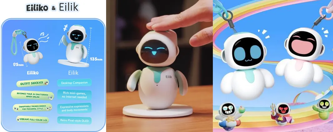 今年 Eiliko 上线,乍一看就是 Eilik 的缩小版,新品高度减少了 5cm,在挂饰形态的基础上,增加模块拆分的设计,以实现 Eiliko 的换装功能。功能方面,则在对话功能中加入了 AI 技术支持;并增强社交属性,不同的 Eiliko 随着见面次数的增多,亲密度也会提升。