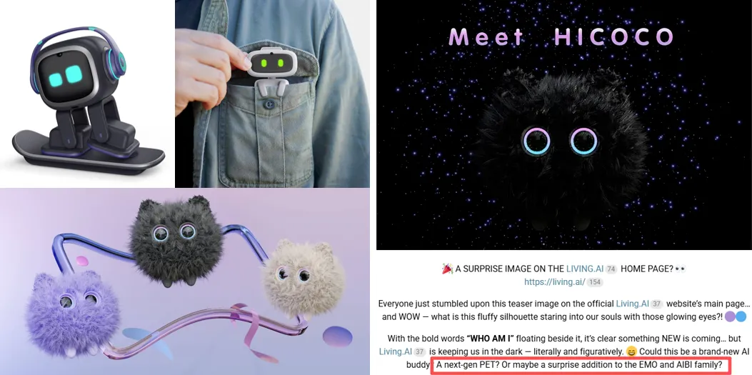 而对于最近官网突然更新的首页产品图,LIVING.AI 在预热活动中表示,新品 HICOCO 可能是“EMO 和 AIBI 的惊喜补充”。按照前代产品从桌面到口袋,体积逐渐缩小的发展趋势,加之目前释出的预告图来看,HICOCO 很有可能也呈现挂饰形态。