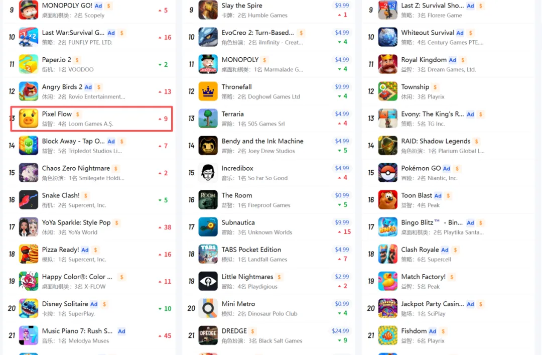 继毛线之后,土耳其厂商拿出了新法宝:《Pixel Flow》正在美榜悄悄爬升。
