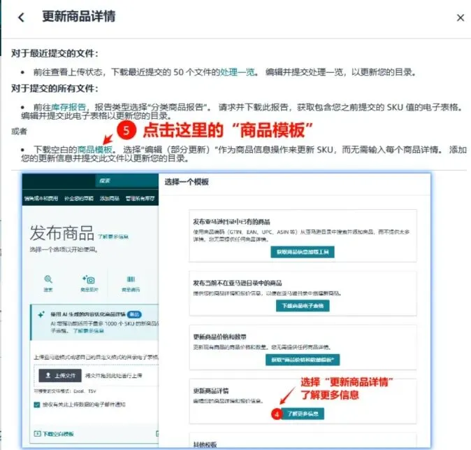 2.打开页面后,选择【更新商品详情】里的“了解更多信息”,选择【下载空白的商品模板】