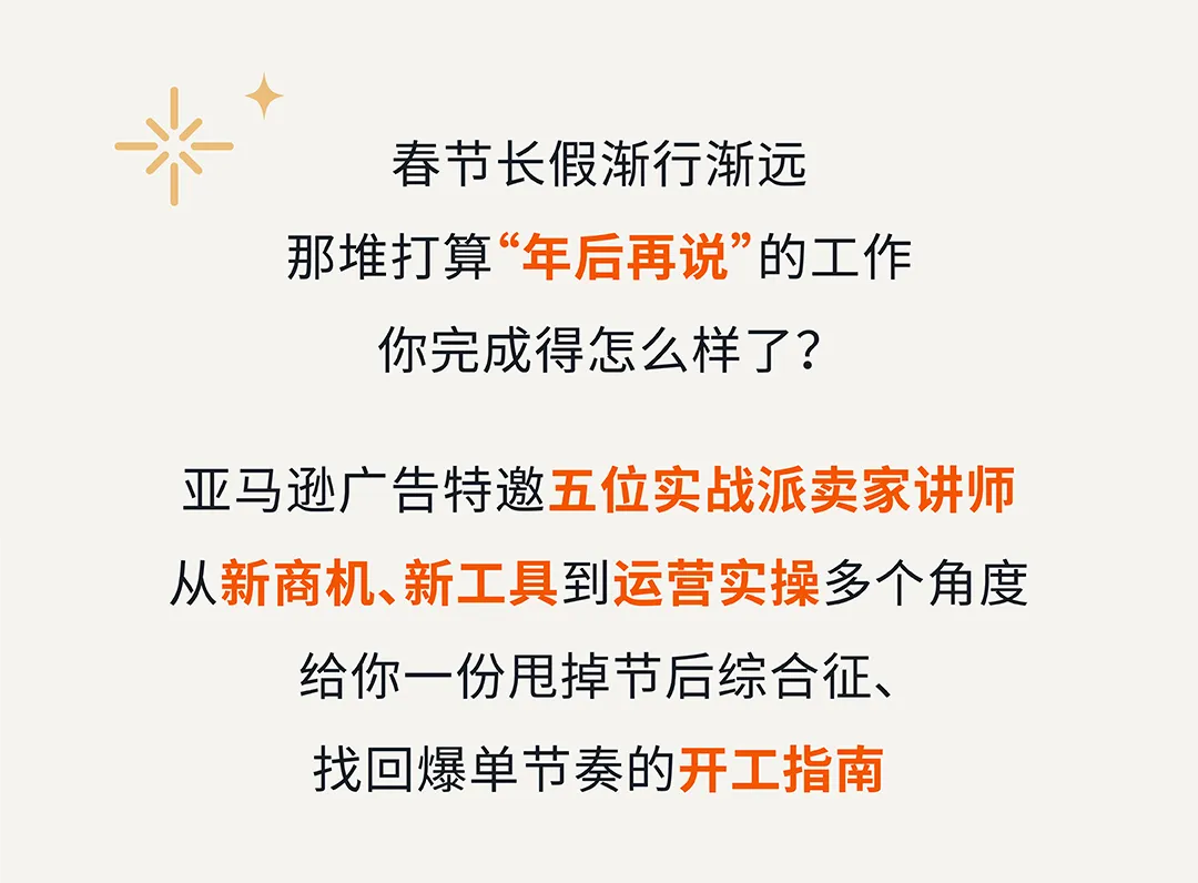 开年复工,广告预算怎么花?面对2026年新的广告环境,亚马逊广告特邀五位实战派卖家讲师——大雄、Davie、小波儿、废费、Elisa,带来一份热气腾腾的“开工指南”,助你甩掉节后综合征,找回爆单节奏!