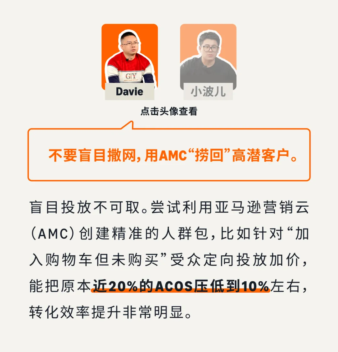 面对AI浪潮,他们分享了最新的亚马逊广告打法:小波儿力推“商品推广视频+创意智能体”,称其能显著提升点击与转化;废费则认为AI能高效产出“80分”素材,让团队精力聚焦于核心策略。关于永恒的ACOS话题,Davie分享了利用亚马逊营销云(AMC)捞回高潜客户的亚马逊广告优化经验,能将ACOS从20%压至10%左右;小波儿则强调要分析产品生命周期,衰退期果断砍预算。