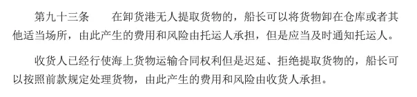 “在卸货港无人提取货物的,船长可以将货物卸在仓库或者其他适当场所,由此产生的费用和风险由托运人承担,但是应当及时通知托运人。”