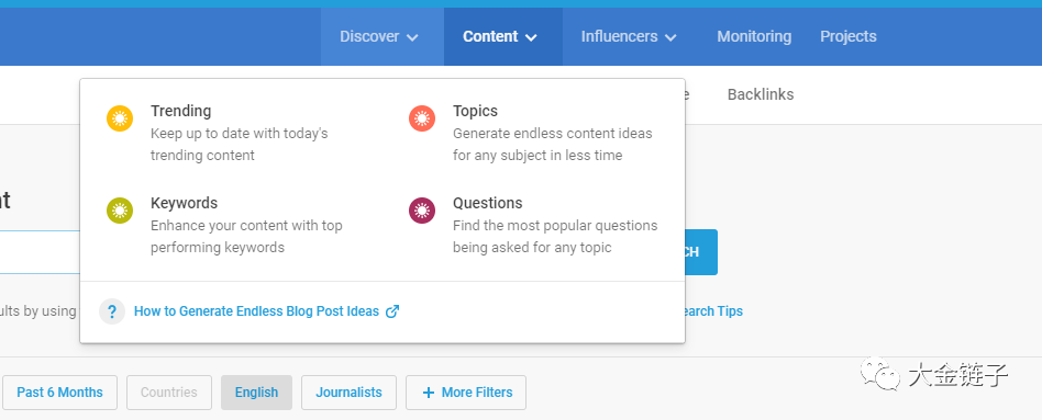 13.Buzzsumo Content :这一功能主要是用来发现与特定话题相关的热门内容。它分为4个板块:Web: 研究互联网上所有的热门内容;Facebook:搜集分析Facebook上面的热门内容;Youtube: 分析YouTube上面的热门视频;Backlinks: 为网站找到相关的链接资源。