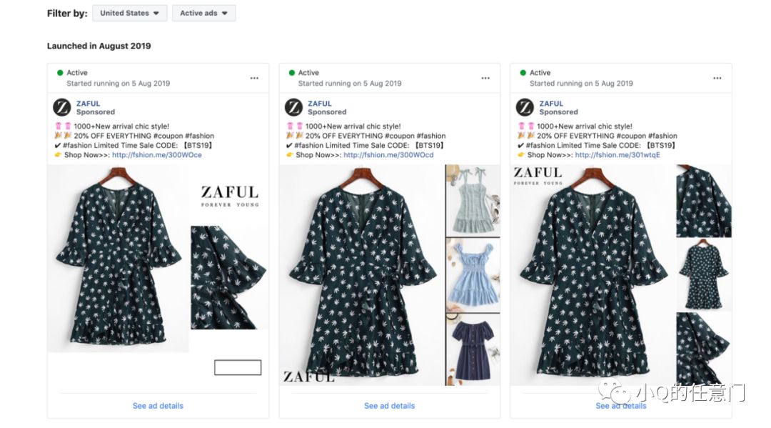 比方说输入zaful,选择你想查看的国家,就可以看到zaful投放的一系列广告。我们可以看到zaful的文案是怎么编辑的,素材是什么,标题怎么写的等等。