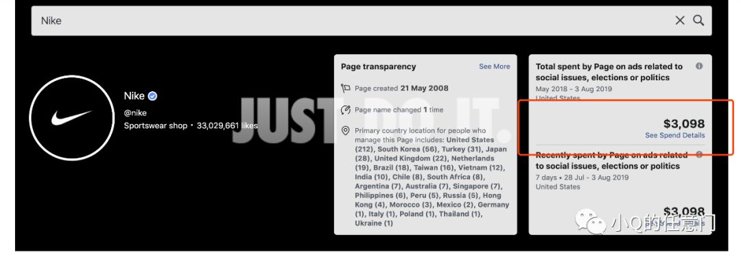 2、如果Facebook主页的广告带有政治色彩,在这里可以看到具体的广告花费,比如这个: