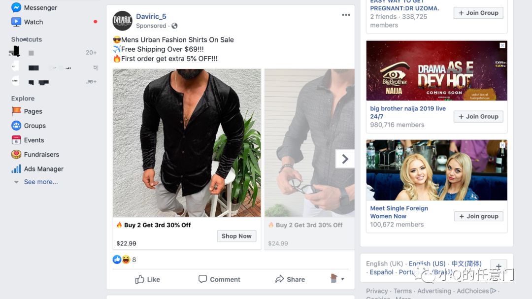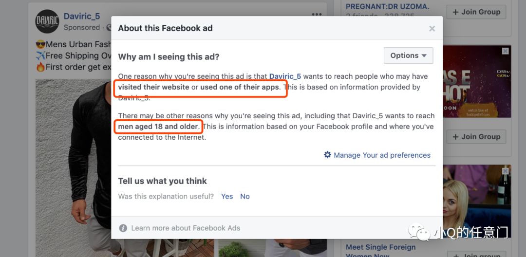 上面这个是Facebook推送给我的广告,我们点开右上角的三个点,找到“why am I seeing this ad”, 就可以看到这条广告的定位(上面红框)。