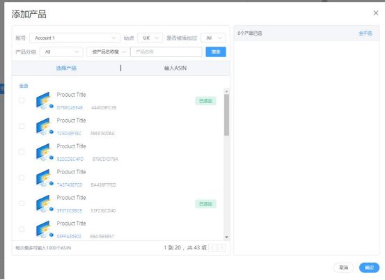 需要强调的是:选择产品时,可以选择排除ASIN、部分ASIN或全部ASIN,当选择部分ASIN时,可以勾选一个或多个ASIN(下图所示),针对这一部分确定的ASIN发送索评邮件;当选择排除ASIN时,被勾选的ASIN不添加,选择的账号站点下的其他ASIN全都自动添加;全部ASIN的情况下,只需选择账号站点,所有ASIN都会自动添加。