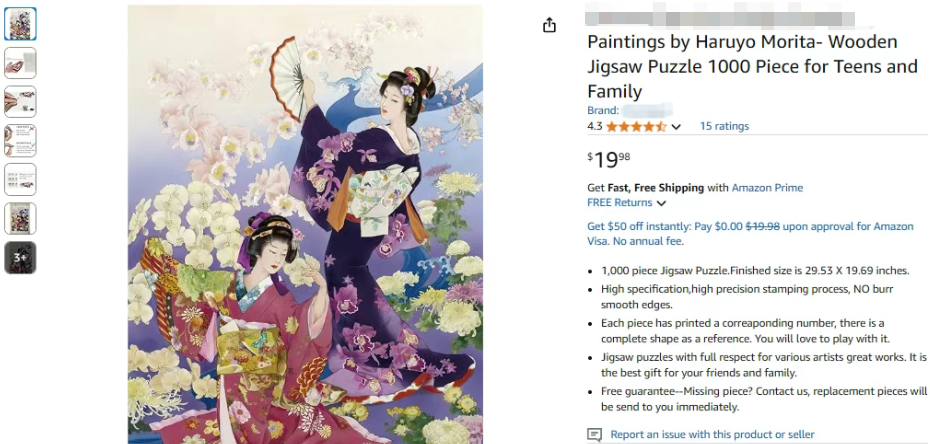 原告Haruyo Morita(森田春代)是一位日本艺术家,擅长以现代手法演绎传统浮世绘风格,深受海外装饰画市场欢迎。