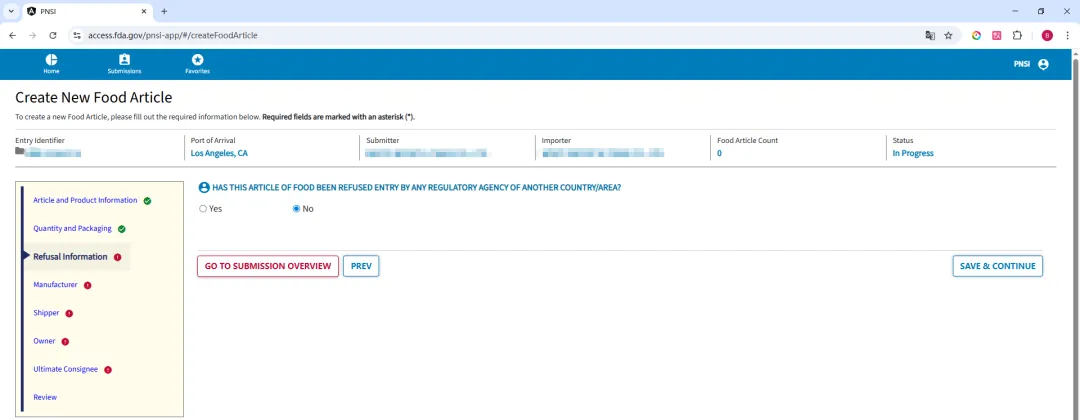FDA 进口食品事先通知 PN 须报告任何曾拒绝该食品入境的国家/地区的名称