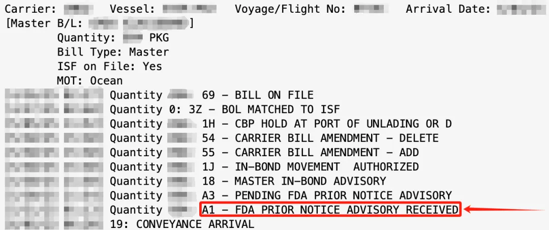 ACE 状态代码 A1:该批货物已向美国食品药品监督管理局 FDA 提交了事先通知 PN