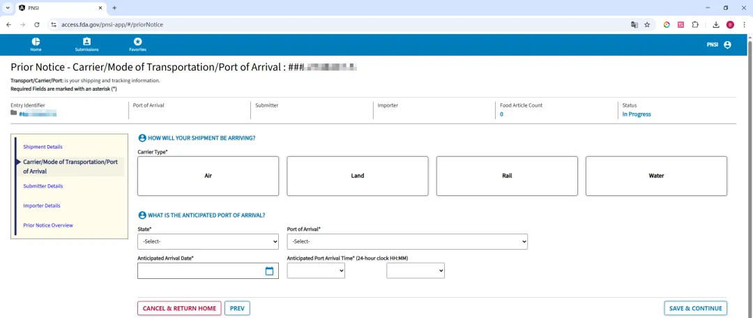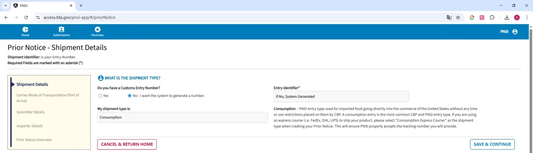 否。必须向 FDA 提交事先通知。如果你是美国海关和边境保护局 CBP 的 ABI/ACE/ITDS 系统的授权用户,可以通过 ABI/ACE/ITDS 电子申报接口向FDA提交事先通知。如果你不是美国海关 ABI/ACE/ITDS 系统的授权用户,可以安排授权用户提交事先通知,或者你也可以通过 FDA PNSI 系统提交。