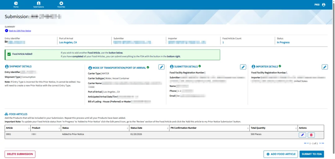若通过 FDA 的 PNSI 系统提交事先通知,提交成功后将收到一个事先通知确认号(PN Confirmation Number)(21 CFR 1.279(d))。如随后通过 CBP 的 ABI/ACE/ITDS 系统提交进口报关或入境申请,则必须在报关时以合规性声明(Affirmation of Compliance)的形式填报该 PN 确认号。该 PN 确认号使 CBP 能够确认相关食品已依法向 FDA 提交了事先通知。
